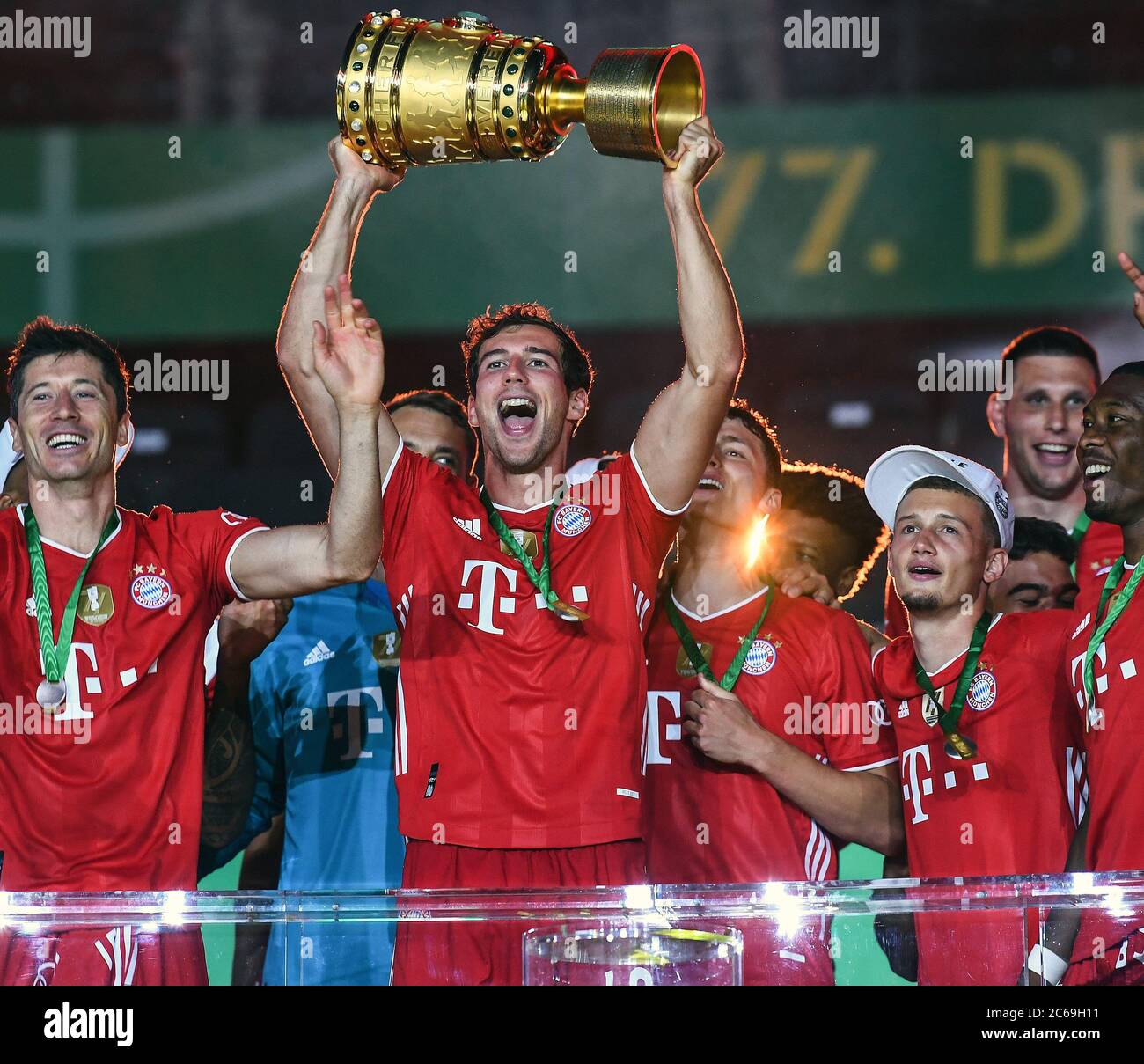 Firo Fussball Pokalfinale Saison 2019 2020 04 07 2020 Dfb Pokal Finale Der Manner Bayer Leverkusen Fc Bayern Munchen Munchen Siegerehrung Fc Bayern Munchen Team Ist Pokalsieger 2020 Leon Goretzka Hat Das Dfb Pokal Siegerpokal Pokal